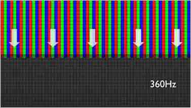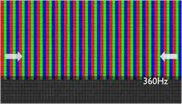 传统液晶驱动是从左到右单向进行,,,在画面更新速度愈来越愈快的情况下,,位于驱动线路末端的右下角区域,,,,画素的闸极来不及在短时间内获得足够电压,,无法显示出正确的颜色资讯。。 |