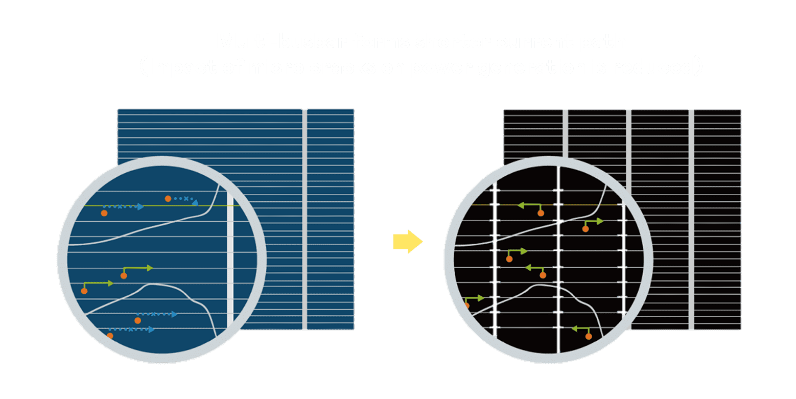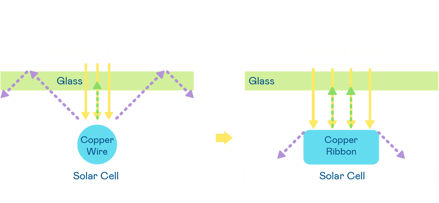 • 电池使用多条铜导线 (Copper wire) 于电池片上形成较短的电流路径,,提高电流收集效率,,,,采用圆形设计的铜导线较传统扁平式的铜焊带 (Ribbon),,,可增加入射至电池的光线量。。。。